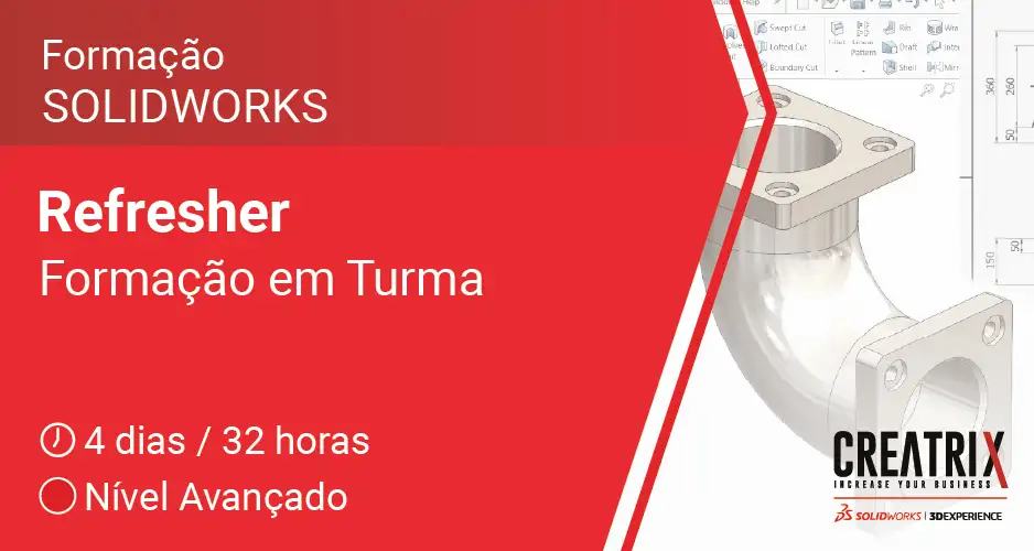 Descrição: SOLIDWORKS Refresher destina-se a rever as funções do software SOLIDWORKS, para utilizadores que podem ter estado afastados da sua utilização regular por um longo período de tempo. Inclui sessões de formação e exercícios selecionados de: SOLIDWORKS Essentials, Advanced Part Modeling e Assembly Modeling.